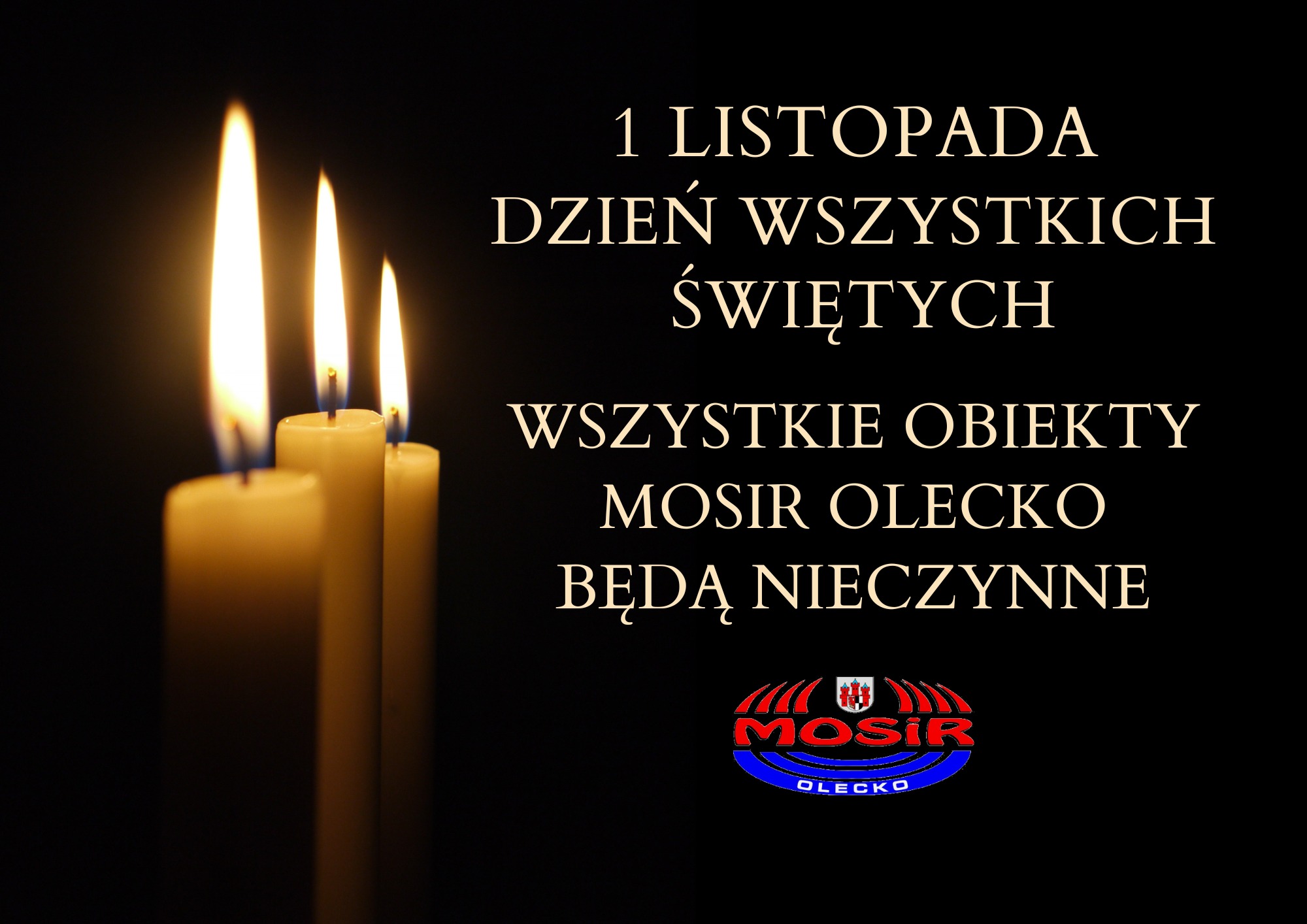 1 listopada obchodzona jest uroczystość Wszystkich Świętych. W tym dniu kompleks sportowo-rekreacyjny MOSiR Olecko będzie zamknięty. Na Halę Lega oraz pozostałe nasze obiekty zapraszamy w innym terminie.