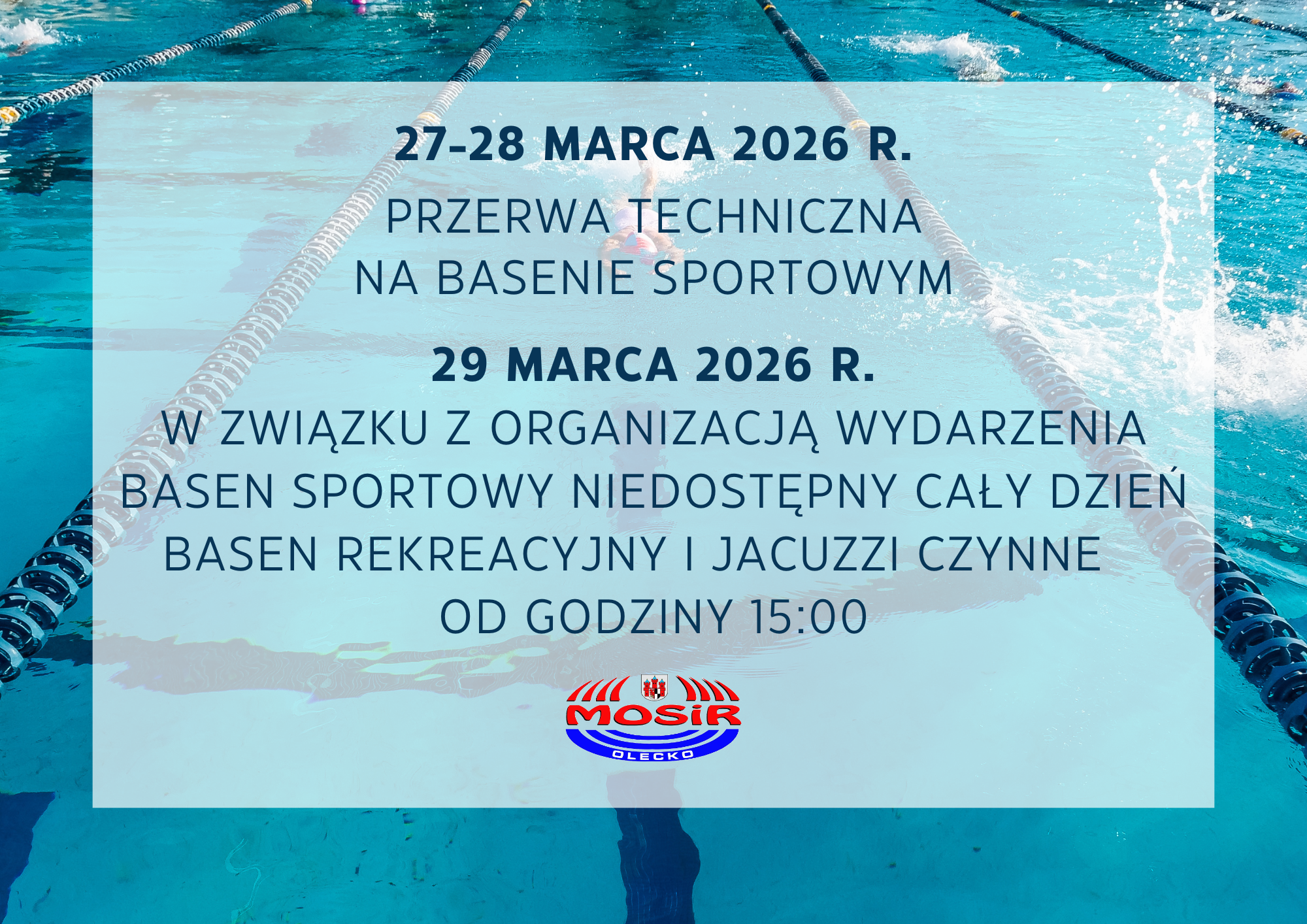 29 marca (niedziela) w związku z organizacją wydarzenia basen sportowy będzie niedostępny cały dzień. Basen rekreacyjny i jacuzzi czynne od 15:00.