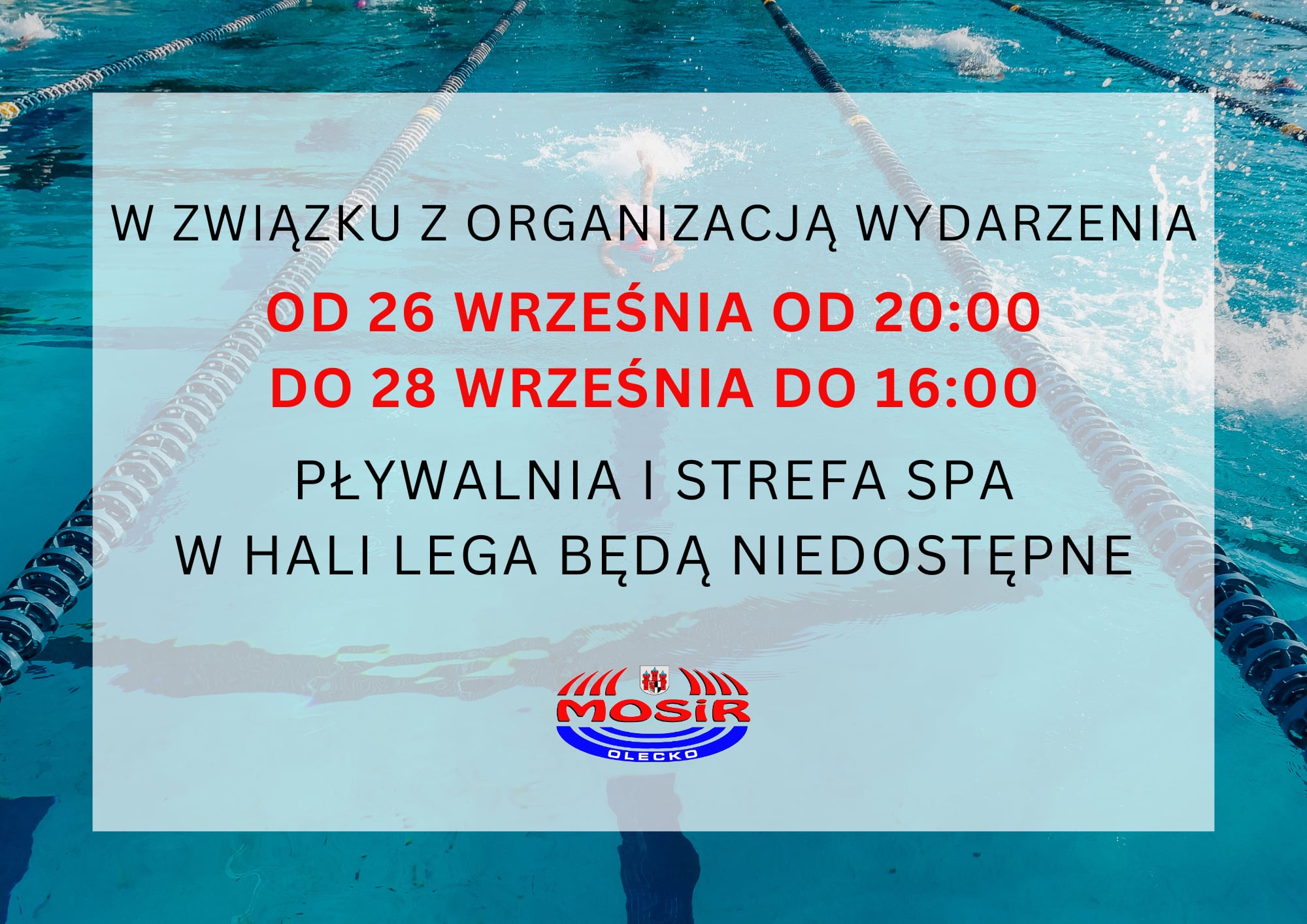 W związku z organizacją wydarzenia od 26 września od 20:00 do 28 września do 16:00 pływalnia i strefa SPA w Hali Lega będą niedostępne.