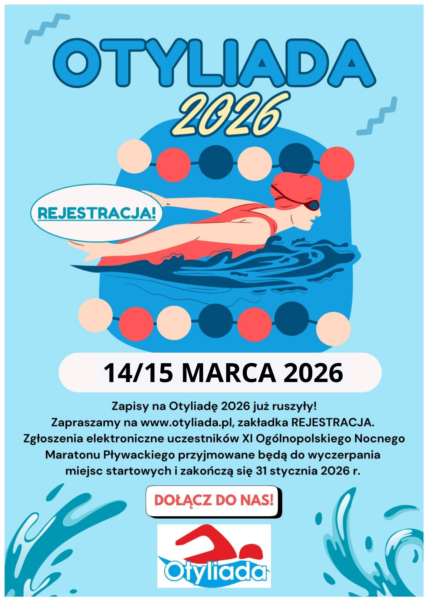 15 grudnia 2025 r. ruszyły elektroniczne zapisy uczestników na XI Ogólnopolski Nocny Maraton Pływacki OTYLIADA 2026, który odbędzie się w nocy z 14 na 15 marca 2026 r. Rejestracja uczestników odbywa się poprzez specjalną zakładkę – KLIKNIJ, na stronie www.otyliada.pl.