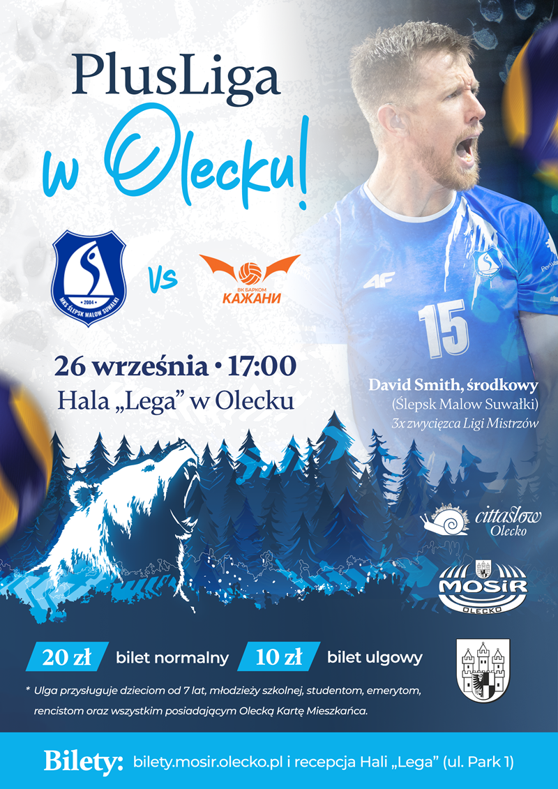 Już w piątek, 26 września, wielkie siatkarskie emocje w Olecku! Na parkiecie Hali Lega zmierzą się dwa zespołu najwyżej w Polsce klasy rozgrywkowej – Plus Ligi. Ślepsk Malow Suwałki zagra z występującym w polskiej lidze Barkomem-Każany Lwów! Zapraszamy na trybuny i do gorącego dopingu.