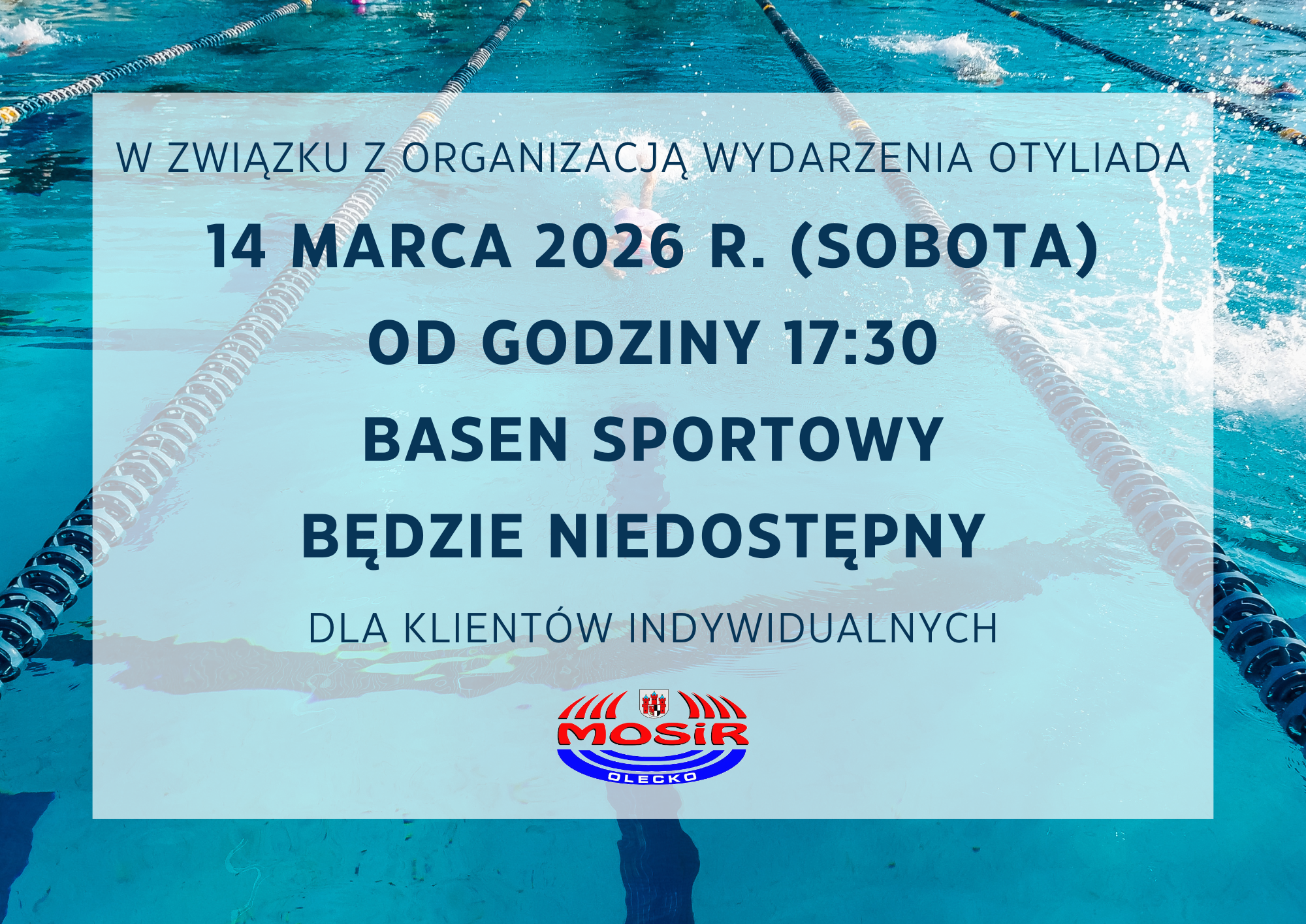 W związku z organizacją wydarzenia Ogólnopolskiego Nocnego Maratonu Pływackiego OTYLIADA w dniu 14 marca od godziny 17:30 basen sportowy będzie niedostępny dla klientów indywidualnych.